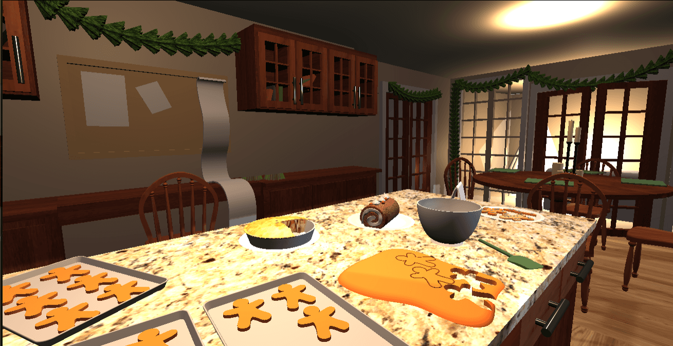 At 141 million views, the “fireplace” video on YouTube is one of the most watched ever - that was the feeling I aimed to recreate in my Cozy Holiday Kitchen VR Environment. I designed the space to evoke those “warm-fuzzy” triggers: soft lighting, holiday décor, dark windows, quiet piano music, and distant family chatter. For users unfamiliar with American Christmas traditions, it serves as a cultural portal into that specific holiday atmosphere. Every element was modeled by me in Fusion 360 and Blender, giving me full control over detail and structure. In Unity, I applied custom materials and decals, animated drawers to open by touch (no clicking required), and added box colliders and XR Grab Interactable components to enhance immersion.