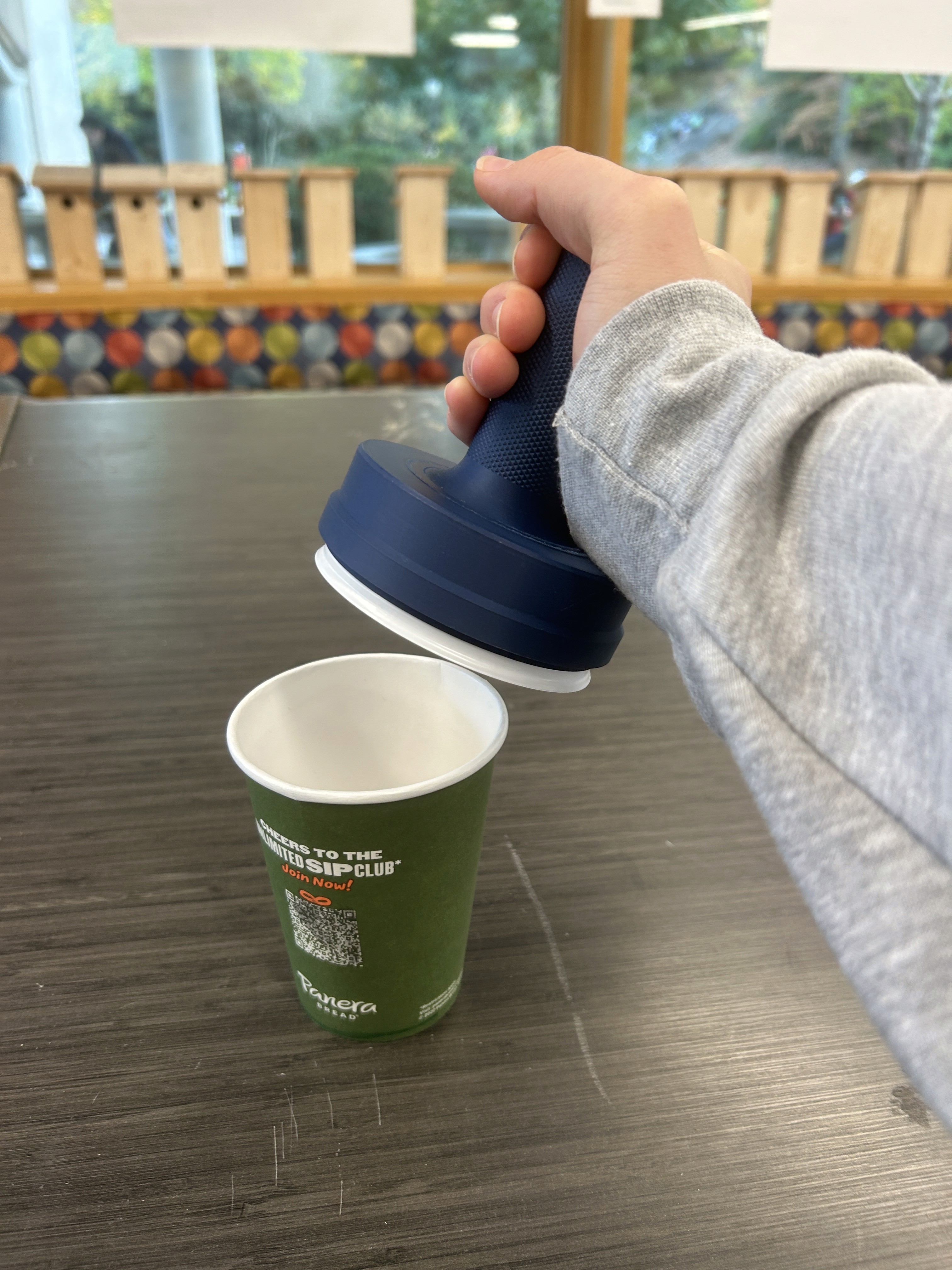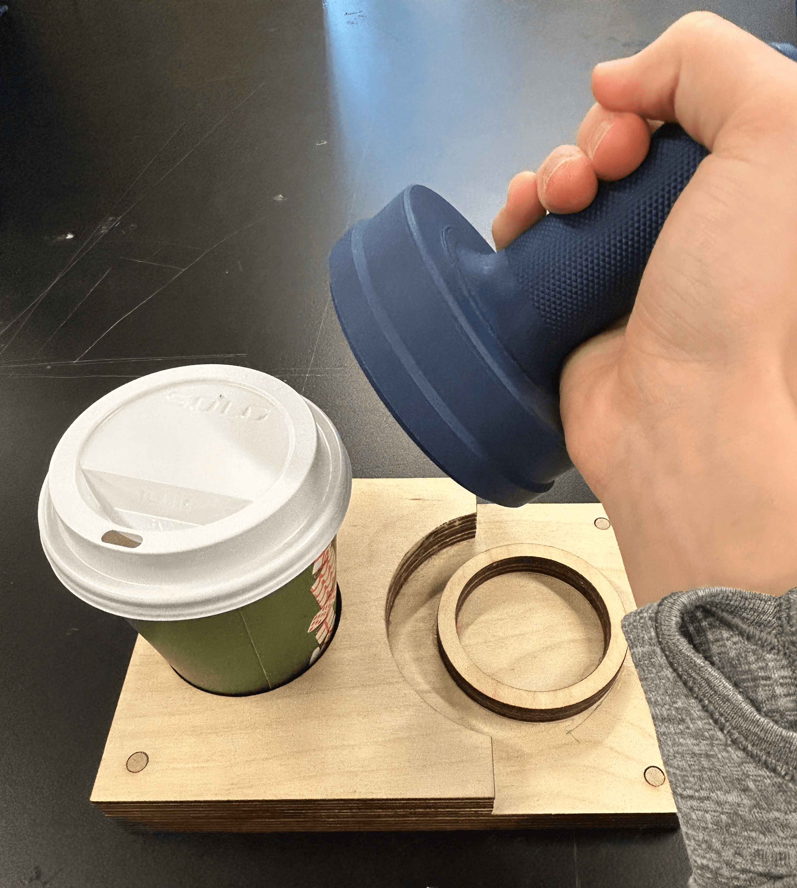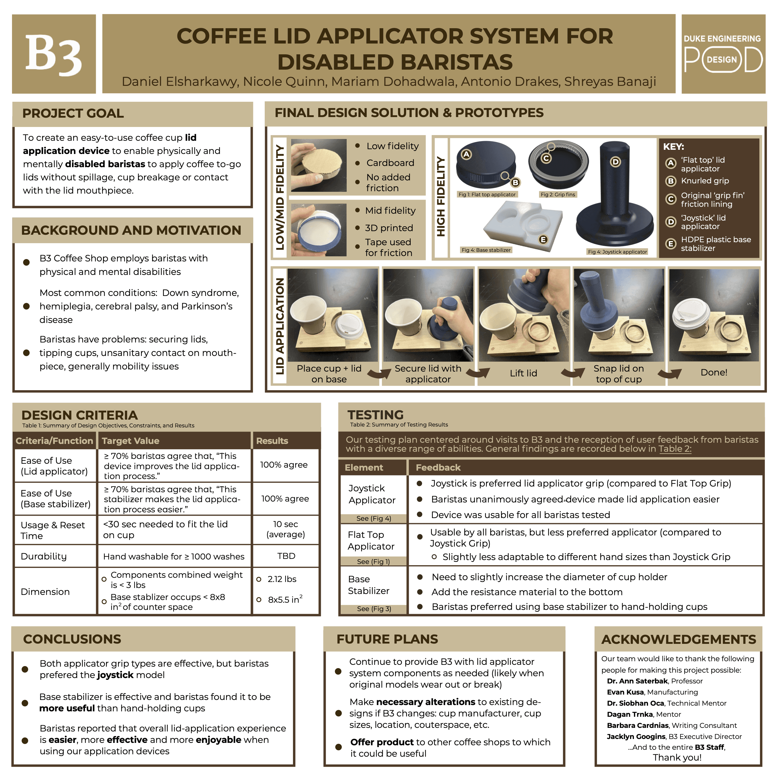 The goal of this project was to create an easy-to-use coffee cup lid application device to enable physically and mentally disabled baristas to apply coffee to-go lids without spillage, cup breakage, or contact with the lid mouthpiece. This project was in close collaboration with B3 Coffee Durham, a cafe that provides employment opportunities to baristas with a wide range of disabilities, to create a more comfortable, productive, and cleanly work environment.