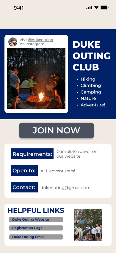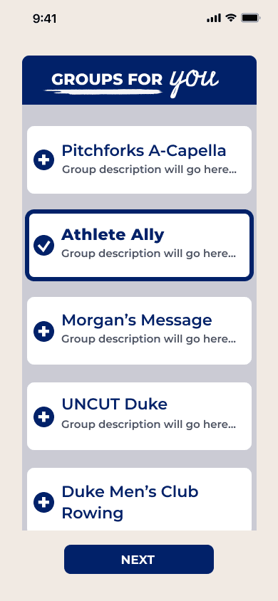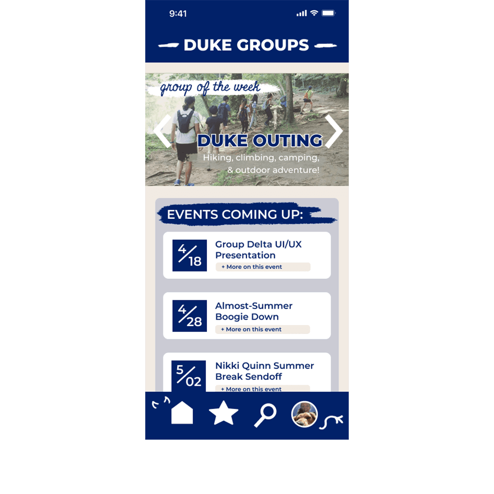 This redesign centered on personalization, accessibility, and connection. The existing DukeGroups platform overwhelms students with scattered, impersonal information, making it difficult to find events that truly resonate with their interests. We reimagined the system to mirror familiar, intuitive social media interfaces - prioritizing ease of navigation, tailored recommendations, and interactive engagement. By allowing users to customize event feeds, share attendance, and earn engagement rewards, our redesign transforms event discovery from a passive experience into an active, community-building process.