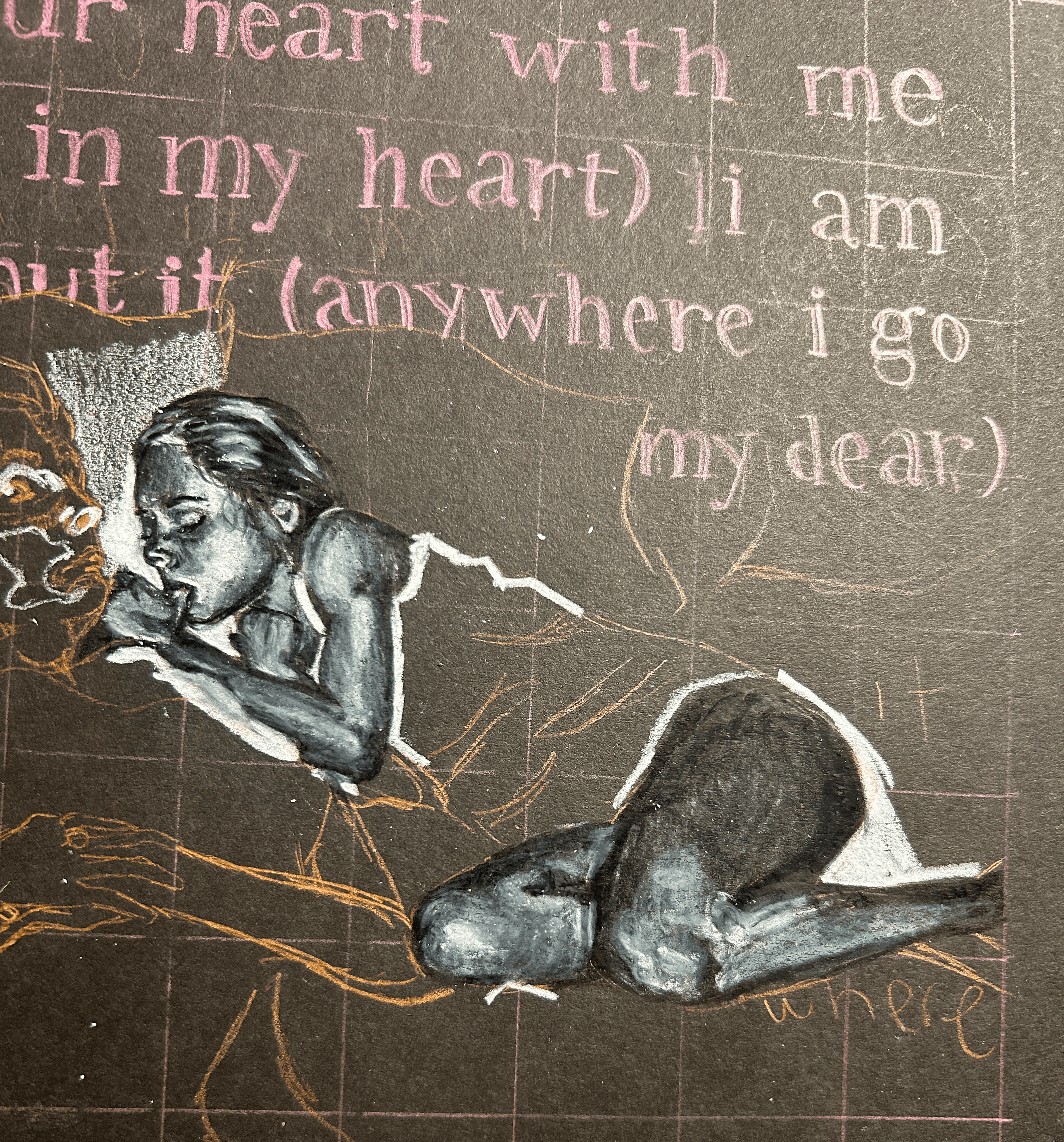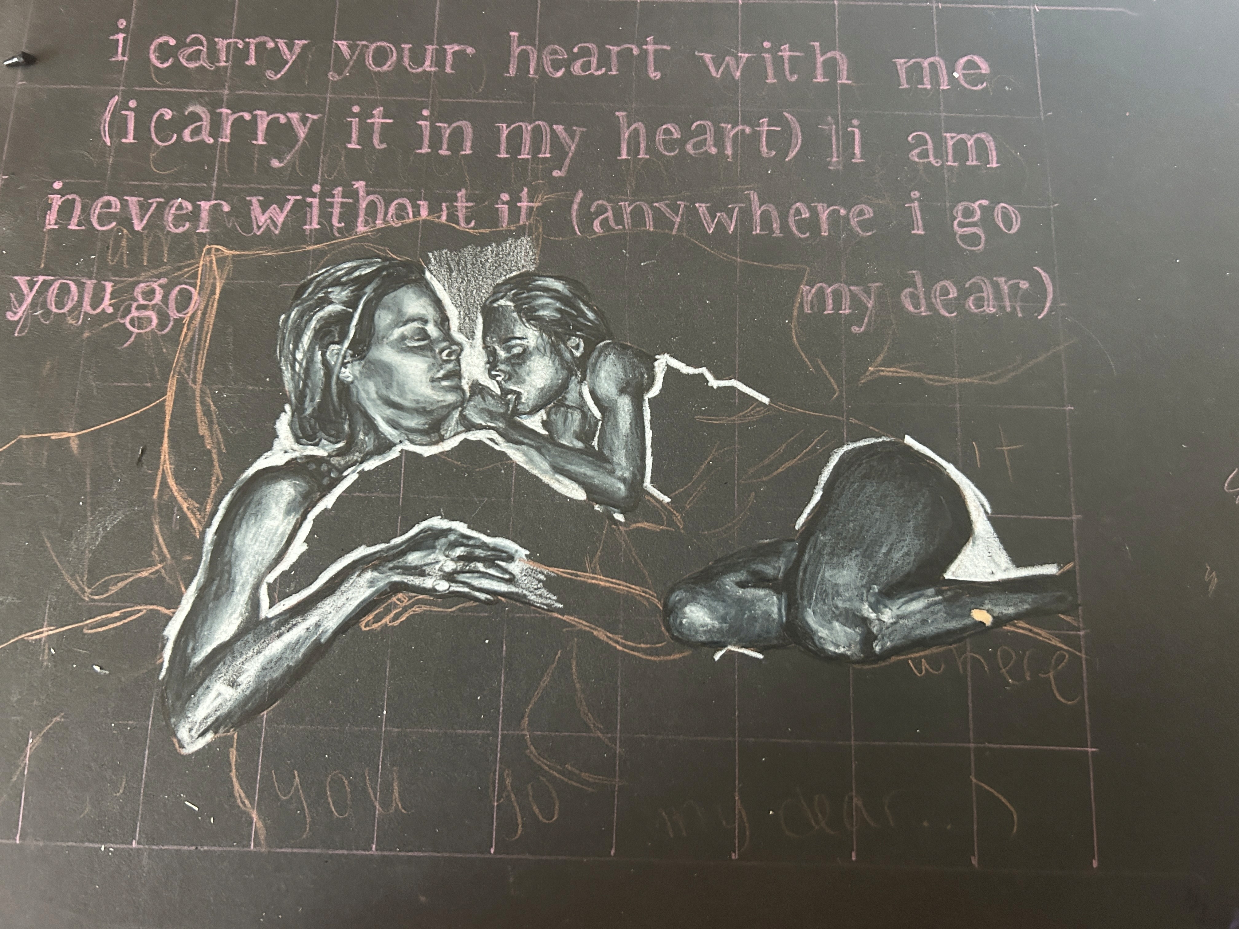This artwork is my rendition of a treasured childhood memory - curled up and asleep with my mom as we listened to a thunderstorm passing overhead. In the background, I wrote out a few lines from my favorite E. E. Cummings poem that used to hang over my childhood bed and holds a special place in my heart. This piece was created primarily with Prismacolor pencils on black mixed media paper. It was a challenge to work on dark-toned paper and switch my typical light-to-dark workflow, but I learned a lot during the process of creating this and am so happy with how it turned out.