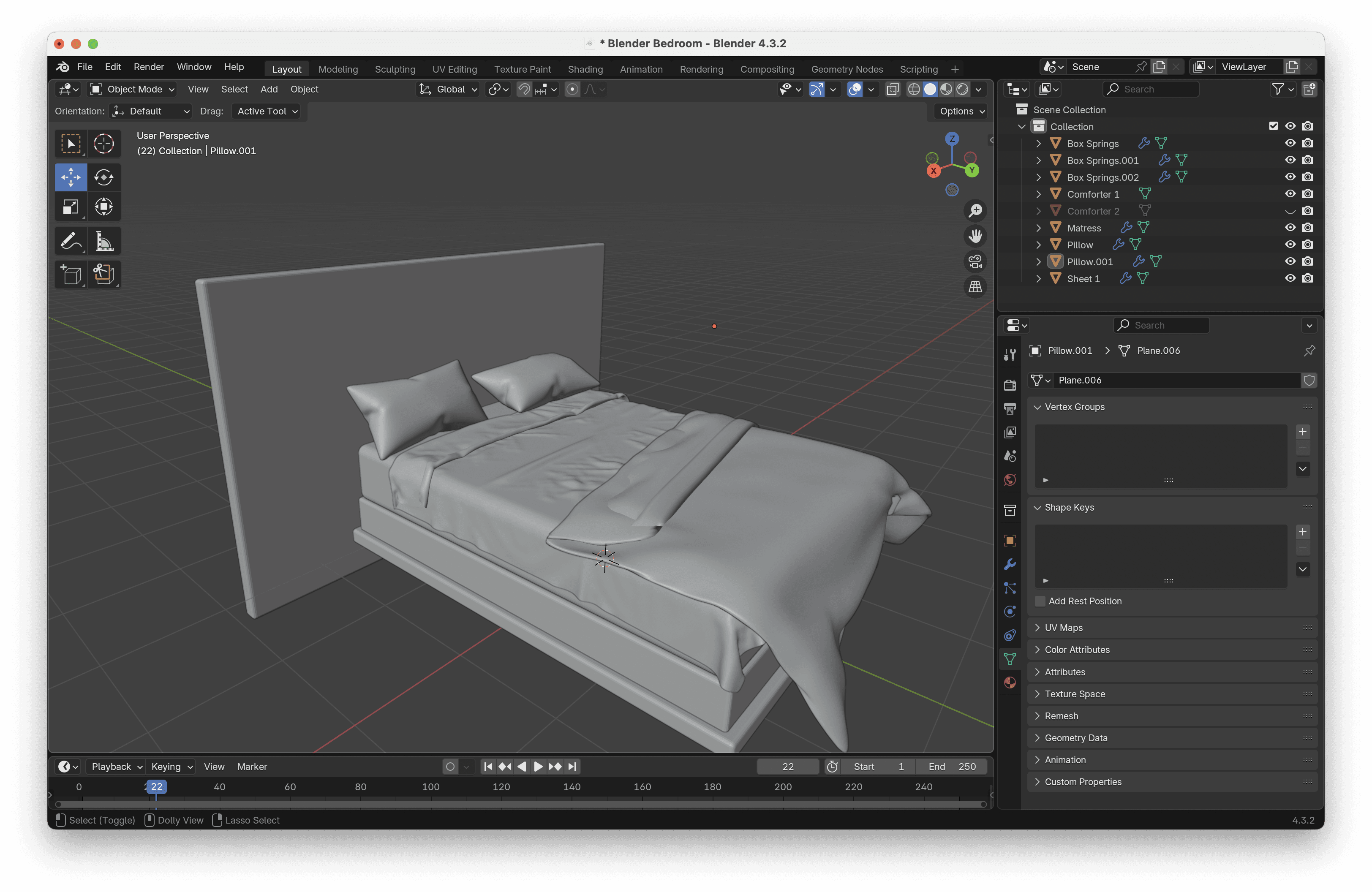 Just some fun modeling my dorm room in Blender! I wanted to experiment with the different material specifications built into the program and better understand the interplay between different friction and gravity settings. I gave myself silk sheets (which might be a little higher-end than reality) but a semi-inflated cotton comforter to gauge the relationship between these two simulations. Mostly just process photos to share at the moment, but I am looking forward to rendering this whole environment in Unreal soon. Learning lots with every new item added to my Blender bedroom!