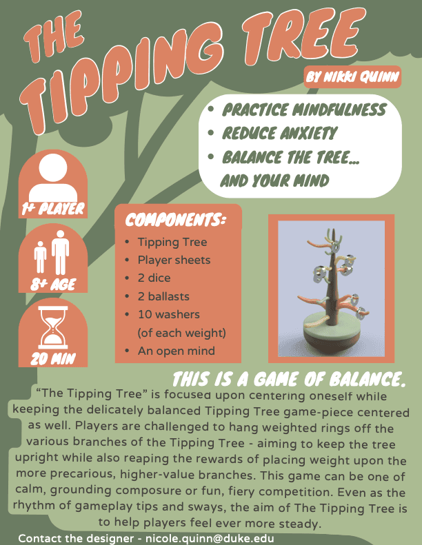 Relax your shoulders, rest your hands across your stomach, and just breathe. Welcome to a place where mindfulness matters most, where you can connect with others or with deeper parts of yourself. The Tipping Tree is a competitive yet calming game of balance where you can challenge opponents or yourself to keep the precarious Tipping Tree upright. Use this game as a space to reflect, ground yourself, relieve anxiety and have fun.